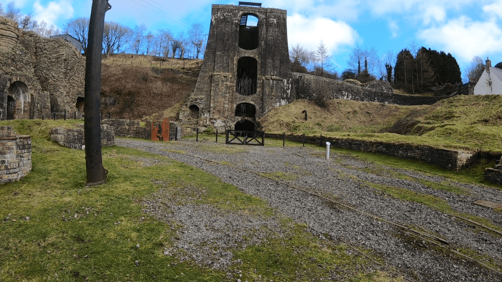 Here is what’s known as the balance tower, it was constructed to be a lift to connect the lower and upper yards which was powered by the weight of water. It really is the main architectural feature of the ironworks and was built in 1839 by James Ashwell, who was at the time criticized for overspending on the construction of the tower. It was of course intended to take raw materials to the top area of the furnaces but it also provided access to the export route through a tunnel 500 meters to the north, unfortunately it was cordoned off as it was flooded and we couldn’t get access around and inside but we are still able to marvel at the incredible stonework in front. The tower at is the best-preserved example of this type of technology, which was widely used in Welsh mining.