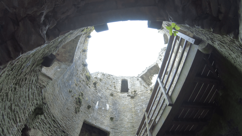 At its peak, the castle consisted of a circular three story tower keep on top of a tall motte overlooking an inner bailey protected by walls and corner towers and also containing some smaller stone buildings and an outer bailey to the north all enclosed by a moat. But no trace remains from either the bailey walls or the other stone buildings which once included a chapel, a great hall and stables but this keep incredibly survives at its full height of 80 feet. Only the roof and the floors are missing, but thankfully we get the chance to head straight to the top for incredible views across the Brecon’s.