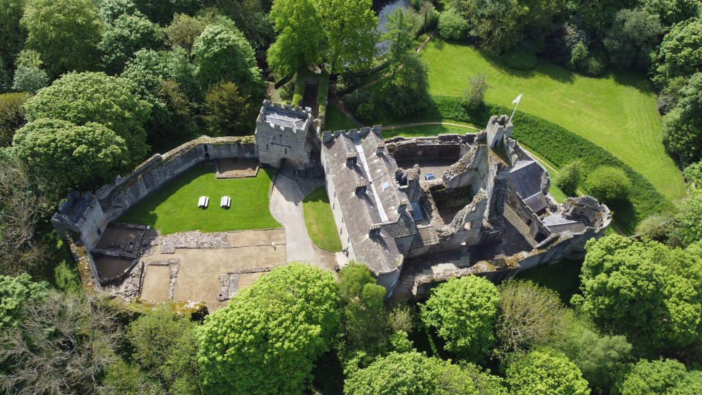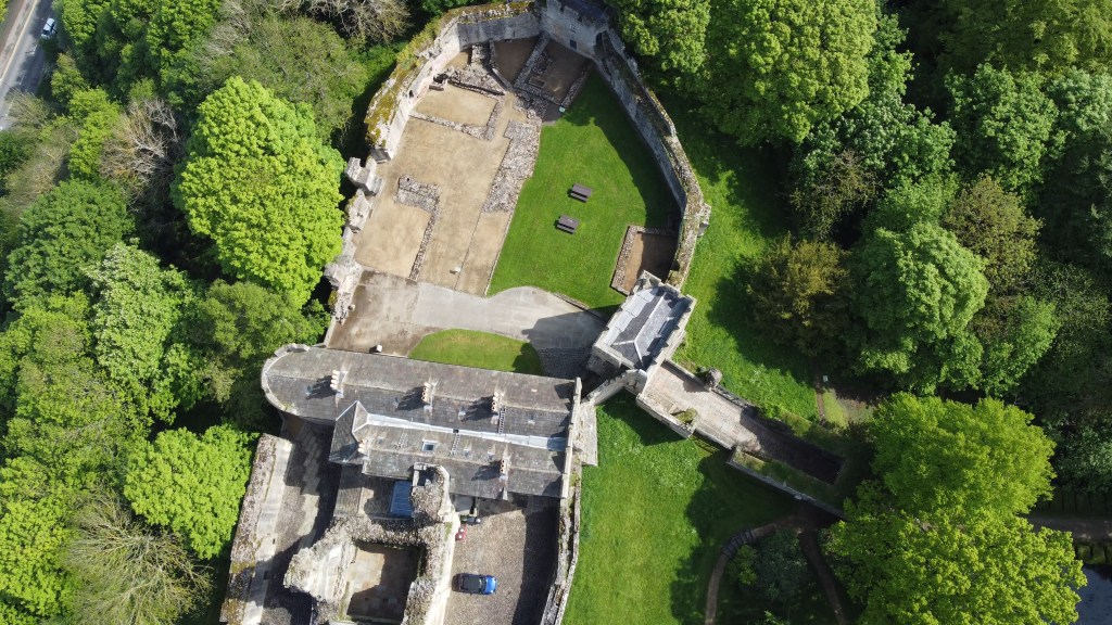 The castle is heavily screened by trees and from the signposted parking area you can see parts of the castle through the trees to the north, beyond a large pond beside the approach road. Following this road brings you to the free-standing barbican, that was intended to help fortify the castle’s main entrance. Beyond this is a causeway which was originally a drawbridge set over a deep dry moat, leading to the castle gatehouse.