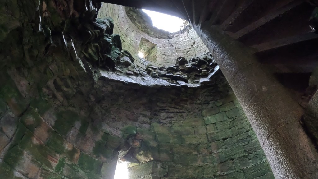 The inner ward occupies a small enclosure that is defined by a moat that can still be seen to the south and west of the later keep. The keep, which is rectangular in plan was built in the late 12th century of high quality ashlar masonry, there might have also been an outer bailey but nothing remains today. It’s hard to imagine, whilst we enter inside the castle on the modern built timber bridge how this castle would have been accessed, well the original and only entrance to the keep was on the first floor, via a long staircase in the keep which also led to an upper storey or gallery and on to the roof at parapet level. Today, we enter inside the basement through a broken opening on the south wall.