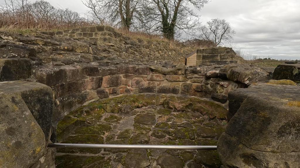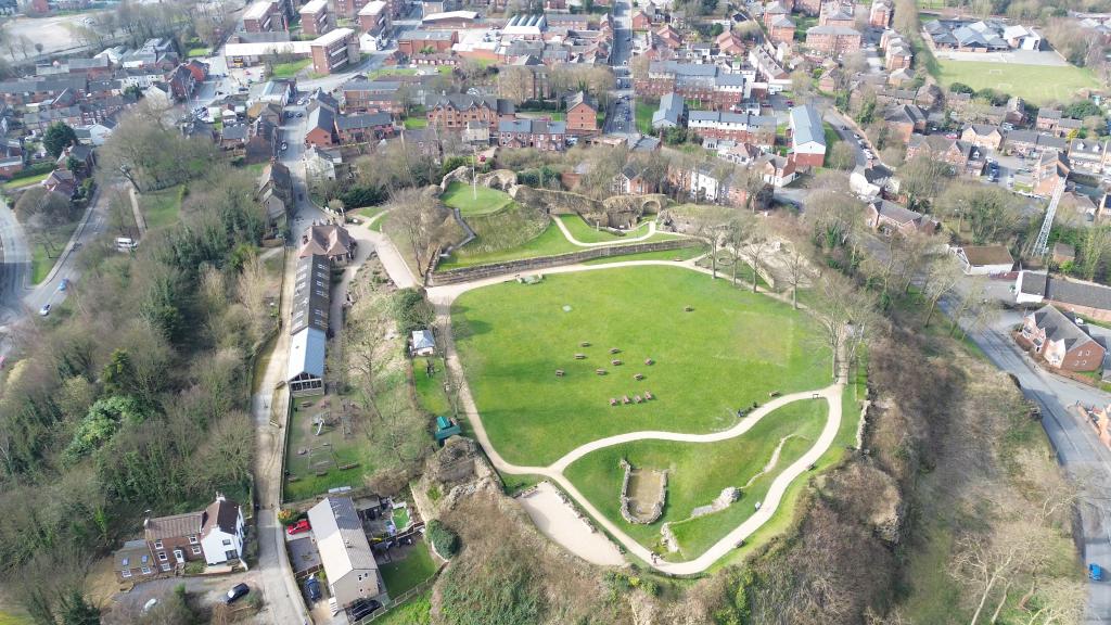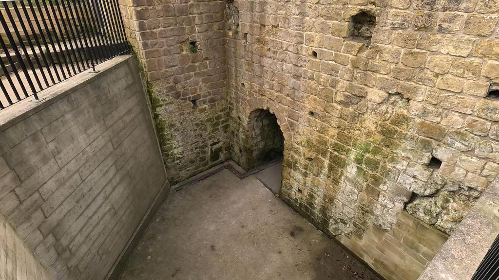The name Pontefract is a combination of words meaning “bent” or “crooked” and “bridge.” Although the castle site is well away from the River Aire—the nearest site of a “crooked bridge” being two miles away—the location was chosen because an important Saxon town already existed on the site, offering a naturally strong defensive position. The Saxons had a royal burgh here called Tanshelf, and the castle overlies part of the Saxon town walls and a cemetery used from the 8th to the 10th centuries.