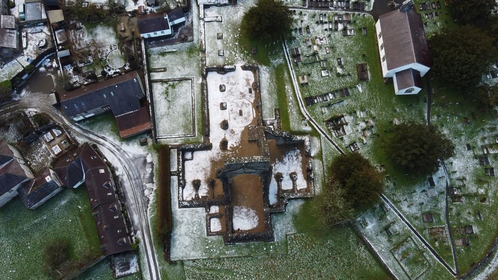 The abbey’s story is one of ambitious dreams curtailed by reality. Drone footage reveals the original vision: a massive, 73-meter-long church designed in a Latin cross shape. Had it been finished, it would have featured an eight-bay nave and twin aisles. Instead, due to constant money troubles and a lengthy, expensive lawsuit with Whitland Abbey, much of the nave was never completed beyond its foundation levels. Today, you can follow the outlines of these bases, which serve as a silent map of the grandeur that was intended.